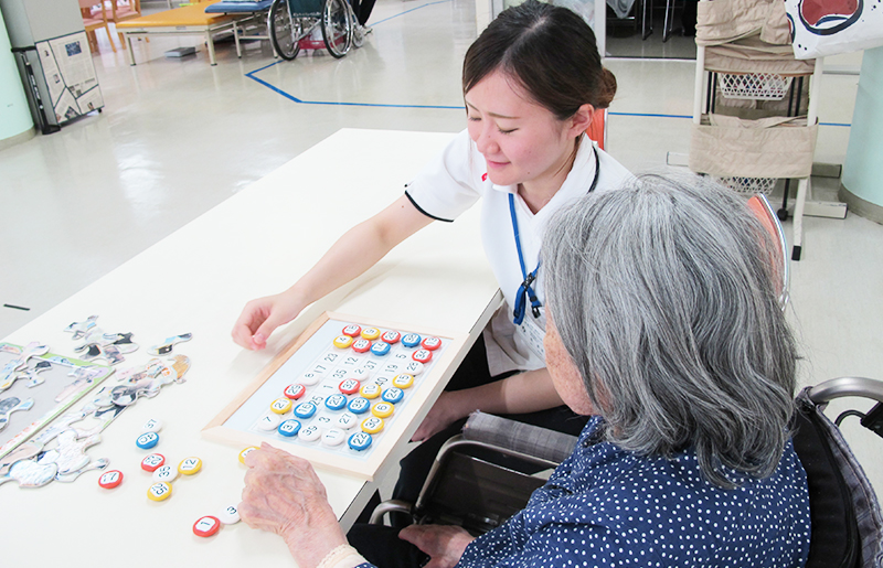 看護士・介護士・理学・作業療法士・管理栄養士・介護支援専門員・支援相談員等、専門スタッフの連携のもと、食事や入浴、排泄などの日常生活ケアや、リハビリテーションにより在宅復帰に向けて自立支援を行います。